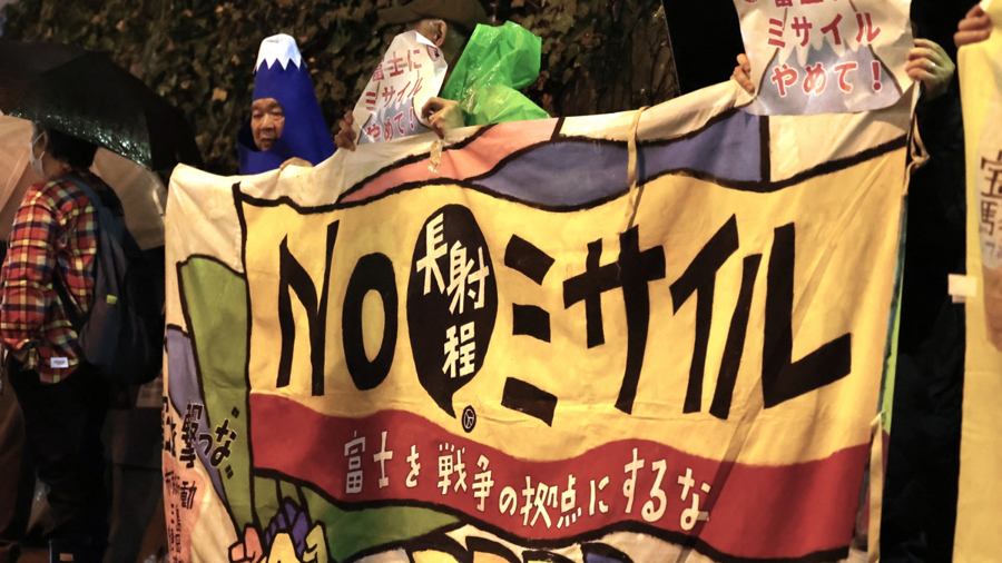 3月31日,各人在日本东京的日本戒备省门前相连抗议政府在熊本县和静冈县部署具备“对敌基地报复才调”的汉典导弹。\n 新华社发