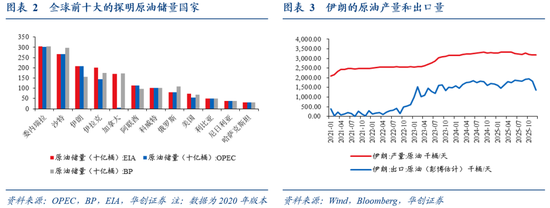 1、石油资源丰富:全球探明原油储量第三,目前日产量约320万桶/日,出口量约180万桶/日。据OPEC和EIA估计,伊朗探明原油储量约2000亿桶,仅次于委内瑞拉和沙特。2025年下半年,伊朗的原油日产量约320万桶/日,约占全球供给的3.2%;原油出口量约180万桶/日,约占全球总出口的4.1%。