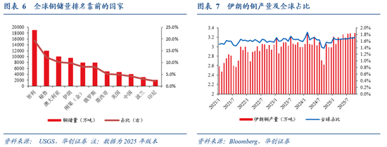 3、铜储量排名前列,产量占比较低。据USGS数据,全球铜储量约9.8亿吨,伊朗铜储量约1亿吨,占比约10%,全球排名第四,仅次于智利和秘鲁,与澳大利亚接近(USGS估计伊朗铜矿石储量约192亿吨,按0.5%品位折算)。若据伊朗矿业开发与革新组织(IMIDRO)数据,伊朗已探明的铜储量占全球已知储量的5%左右,则排全球第七。2025年前10月,伊朗铜产量约32万吨,占全球产量约1.7%。