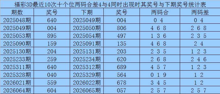 福彩3D第2026068期奖号两码合差分析: