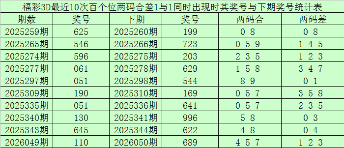 从以上统计不错看出,百个位两码合差1与1同期出现之后其下期两码合差发达最热的4个分手为:0358,本期百个位两码合差不错参考这四码中的数据。