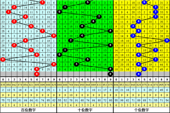 百十位合差分析:上期奖号百十位开出69组合,两码合为5,两码差为3,最近10次百十位两码合5与两码差3同期出当前,其奖号和下期奖号分手为: