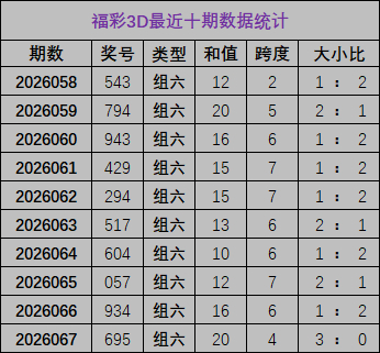 开奖记忆:福彩3D上期开奖号为695,和值为20,跨度4,其中奖号大小比为3:0