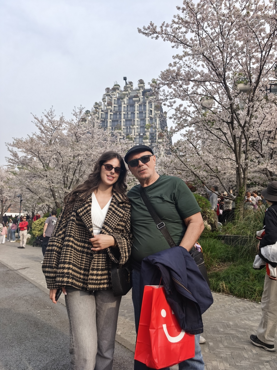 4月4日,塞尔维亚游客塔玛拉和父亲在天安千树旁游览。 李宝花 摄