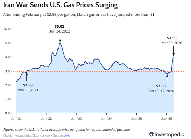 据好意思国汽车协会(AAA)的数据显现,自3月初以来,全好意思平均汽油零卖价钱照旧高潮了1好意思元多,其时全好意思平均价钱为2.98好意思元。下图揭示了油价是如安在短短不到一个月工夫里快速飙升的: