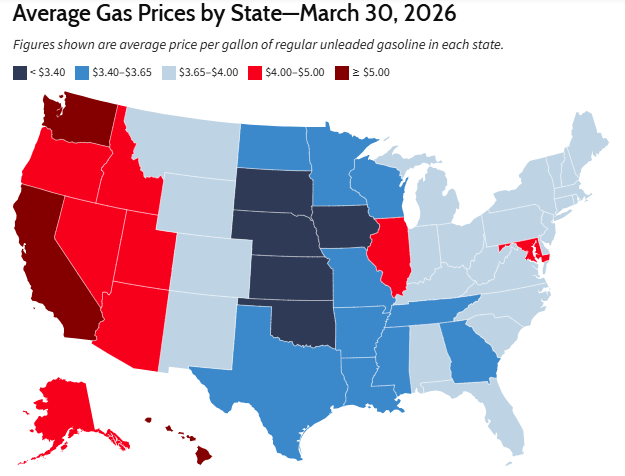 自3月11日以来,好意思国通盘50个州的平均油价齐已异常了每加仑3好意思元。