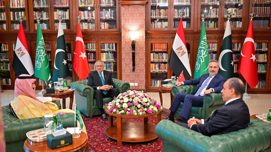 3月29日,在巴基斯坦齐门伊斯兰堡,沙特阿拉伯社交大臣费萨尔(左一)、巴基斯坦副总理兼社交部长达尔(左二)、土耳其社交部长费丹(右二)、埃及社交部长阿卜杜勒阿提举行会谈。\n 新华社发