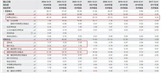 从营业支出项来看,2022年和2023年的退保金分别为3.59亿元、4.28亿元,同比增长229.36%、19.22%;2023年和2024年赔付支出为4.27亿元、9.35亿元,同比增长139.88%、118.97%。