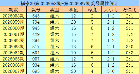 开奖总结:福彩3D第2026067期开出奖号695。奖号时势为组六,奇偶比为2:1,012路比为2:0:1,大小比为3:0,和值为20,跨度为4。